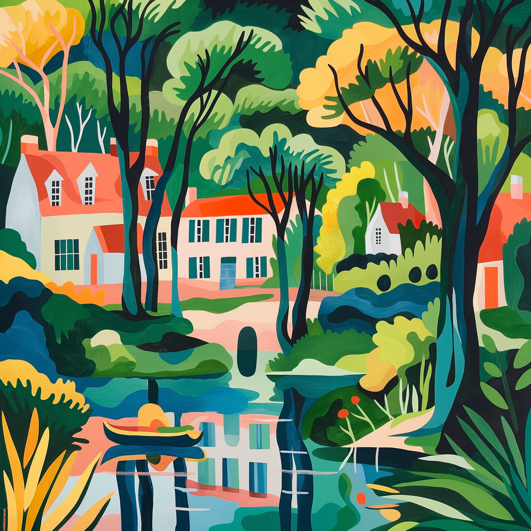 River Village Countryside River Statement wall art for living room, hallway, cottage interior, framed print print from the Spreewald series.